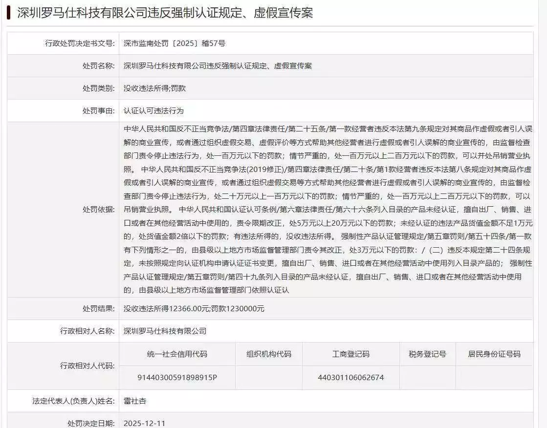 天眼查天眼风险信息显示,近日,深圳罗马仕科技有限公司因违反强制认证规定、虚假宣传,被深圳市市场监督管理局南山监管局没收违法所得1.2万余元、罚款123万元。